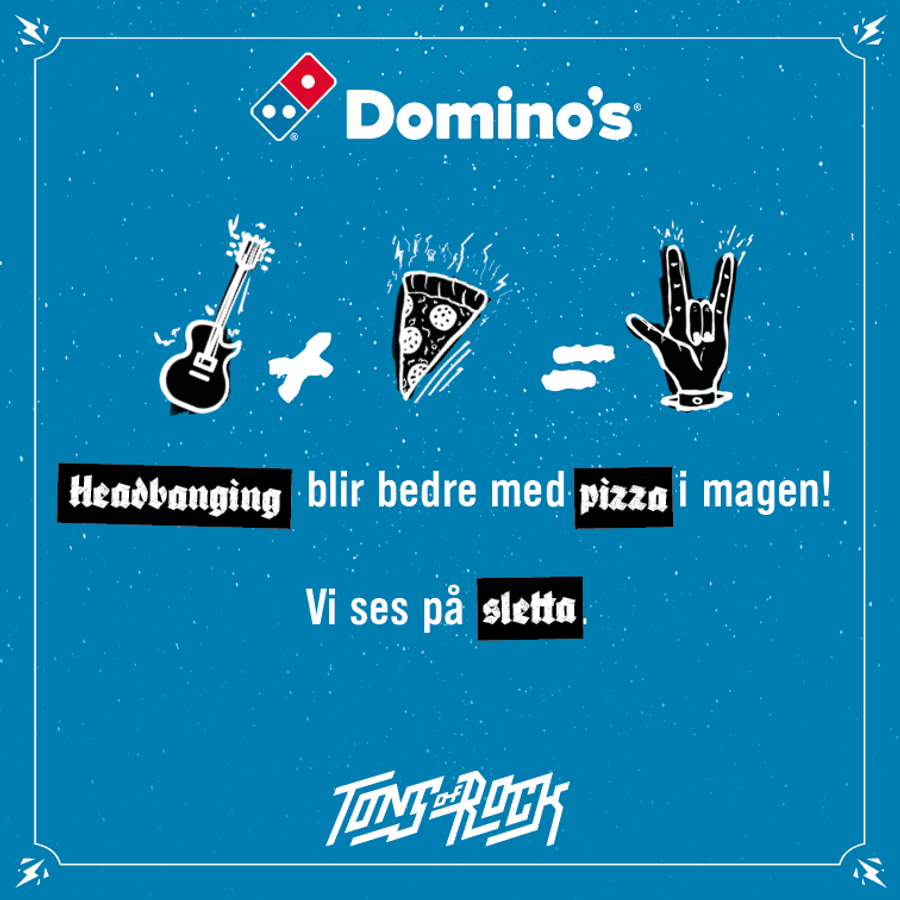 Det skal også lønne seg å være Pizzaklubb-medlem! Som medlem gir vi deg 10 kr avslag på XL-Slice under Tons of Rock. Yes, du får billigere pizza enn de andre! For å cashe inn på dette, se etter de som deler ut klistremerker med Domino's logoen. Viser du appen vår, får du et klistremerke. Og det vider du i kassa. Boom!